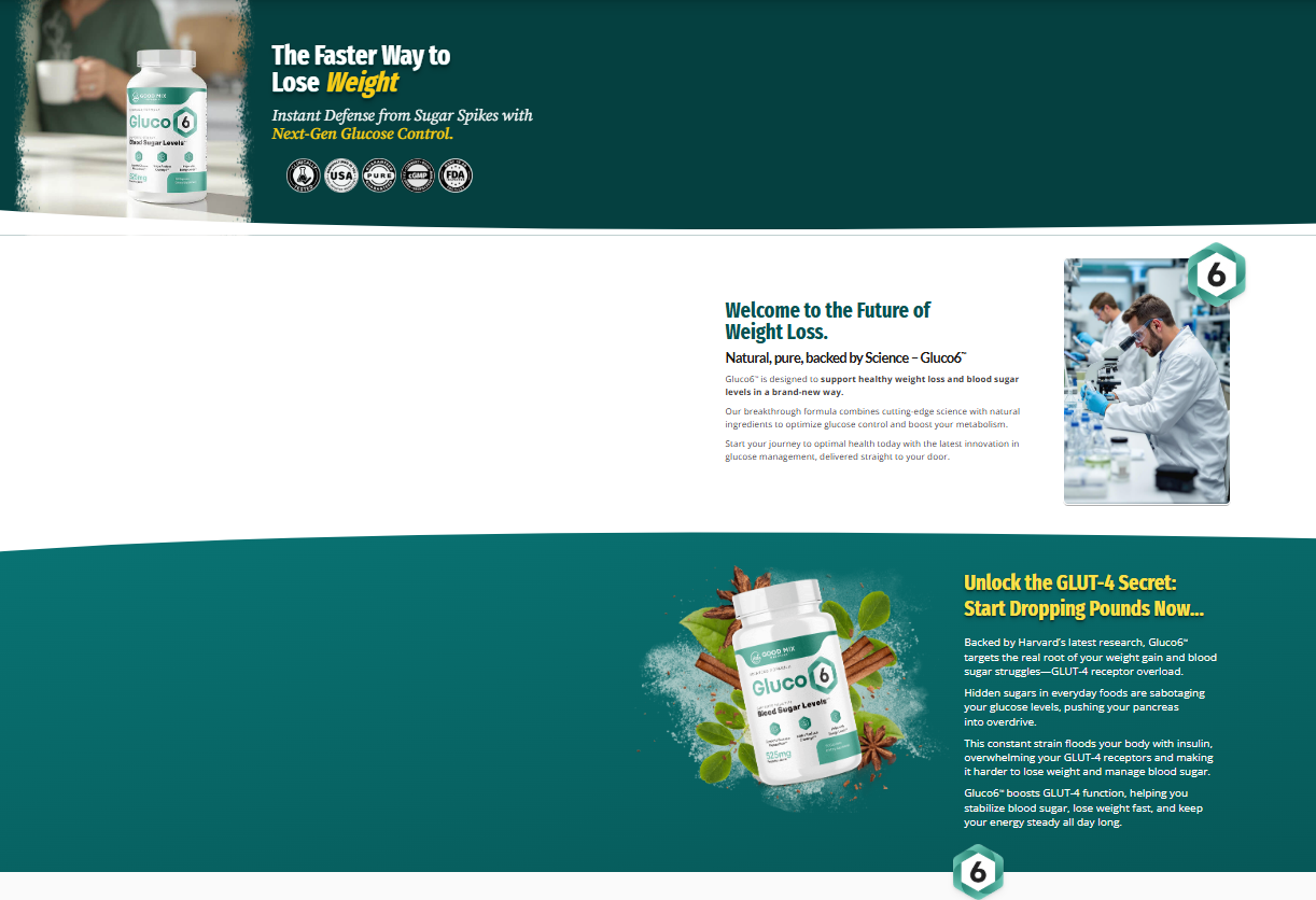 Natural, pure, backed by Science – Gluco6™ Gluco6™ is designed to support healthy blood sugar levels in a brand-new way. Our breakthrough formula combines cutting-edge science with natural ingredients to optimize glucose control and boost your metabolism. Start your journey to optimal health today with the latest innovation in glucose management, delivered straight to your door.